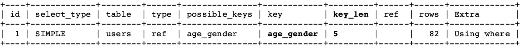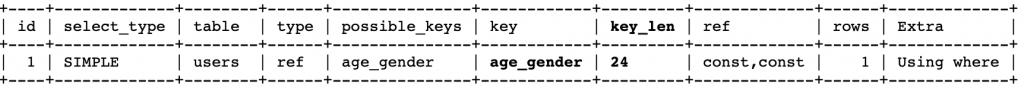 Значение key_len показывает используемую длину индекса. В нашем случае 24 байта – длина всего индекса (5 байт age + 19 байт gender).