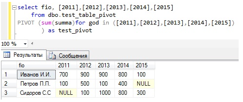 - for god in ([2011],[2012],[2013],[2014],[2015]) — тут мы указываем колонку, в которой содержатся значения, которые будут выступать в качестве названия наших результирующих столбцов, по факту в скобках мы указываем то же самое, что и чуть выше в select;