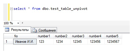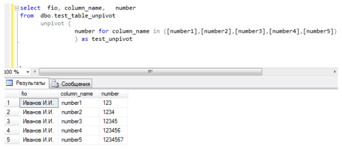 UNPIVOT – это оператор Transact-SQL, который выполняет действия, обратные PIVOT. Сразу скажу, что да он разворачивает таблицу в обратную сторону, но в отличие от оператора PIVOT он ничего не агрегирует и уж тем более не раз агрегирует.